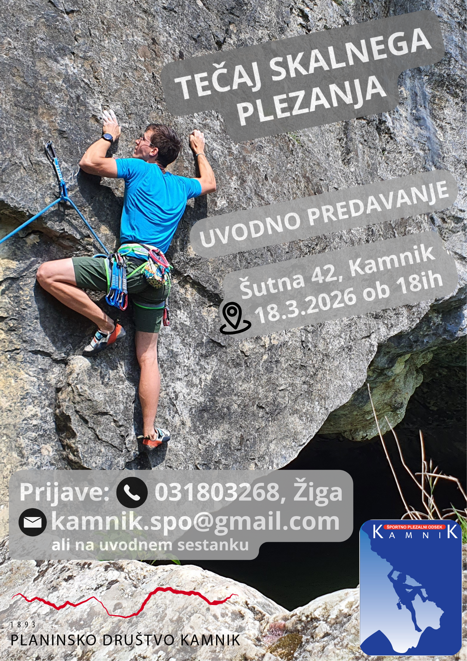 | Sreda, 18.03.2026 | 18:00-19:00 | Uvodno predavanje (predstavitev poteka tečaja) in predstavitev opreme za športno plezanje. Prostori PD Kamnik, Šutna 42 |