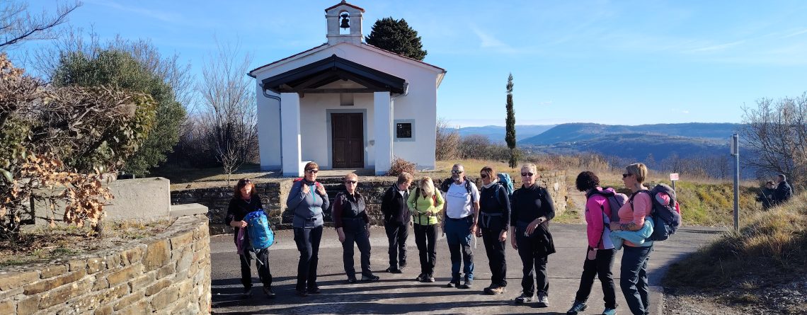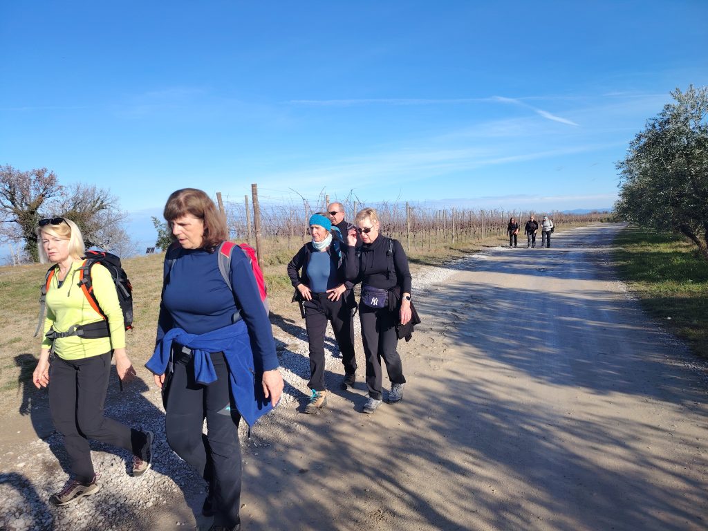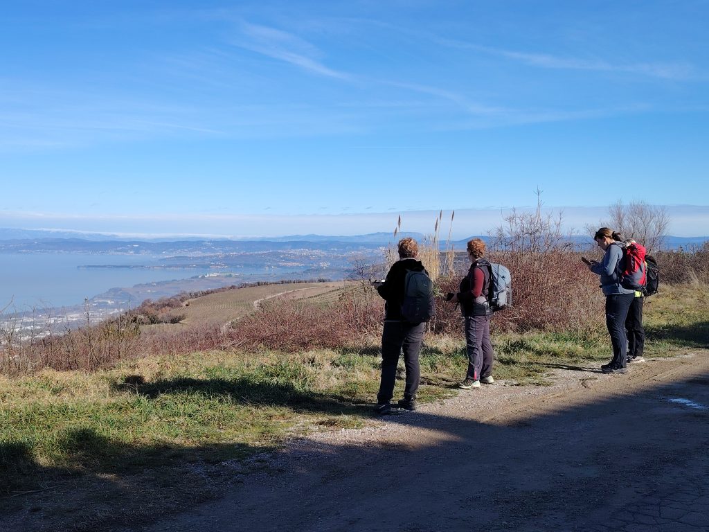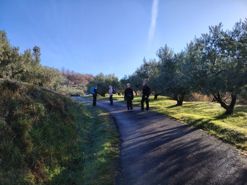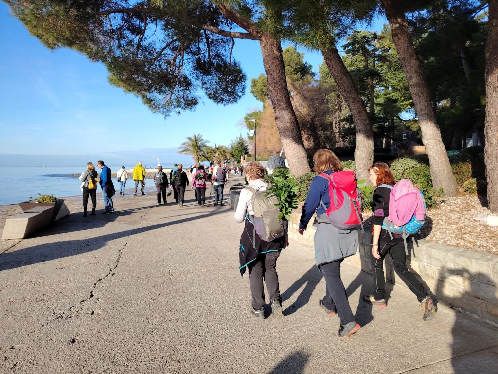 Krenili smo proti obvoznici, pod in nato kratek čas ob njej. Sledil je sprva postopen in nato vse bolj strm vzpon med oljčnik in vinogradi. Pred Baredi se je pot položila, hodili smo po grebenu s čudovitimi razgledi na morje in notranjost slovenske Istre. Najvišjo točko smo dosegli v naslednji vasi, v Šaredu, kjer smo se okrepčali z malico in kavo v lokalnem baru.